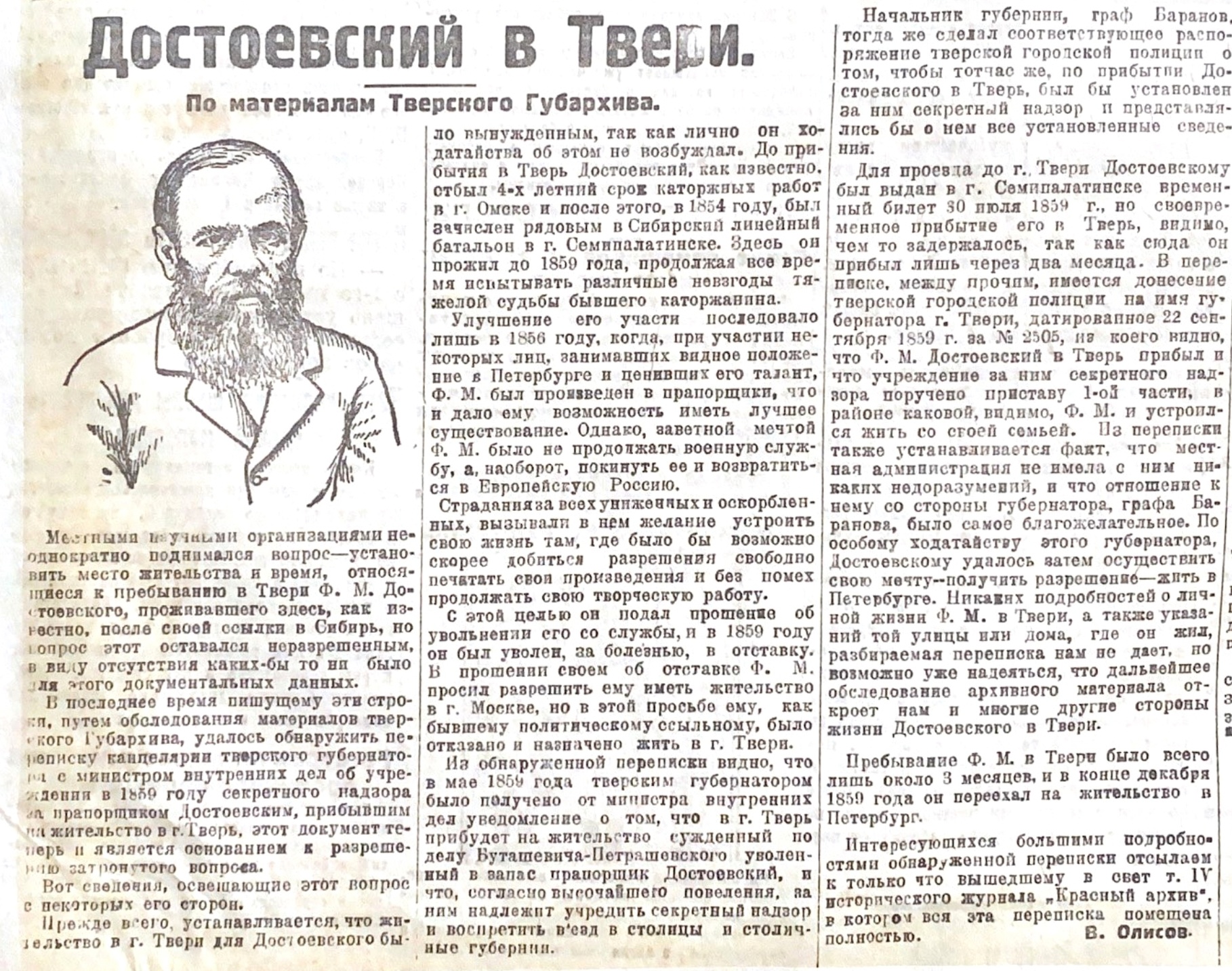 Вопрос о месте и времени пребывании Ф.М. Достоевского в Твери после его ссылки в Сибирь долгие годы оставался нерешенным. Однако, как отмечено в статье В.П. Олисова в газете «Тверская правда» от 16 мая 1924 года, данная проблема была решена благодаря найденным в тверском губархиве документам, из которых следует, что писатель проживал в районе 1-й части г. Твери в период с сентября по декабрь 1859 года.