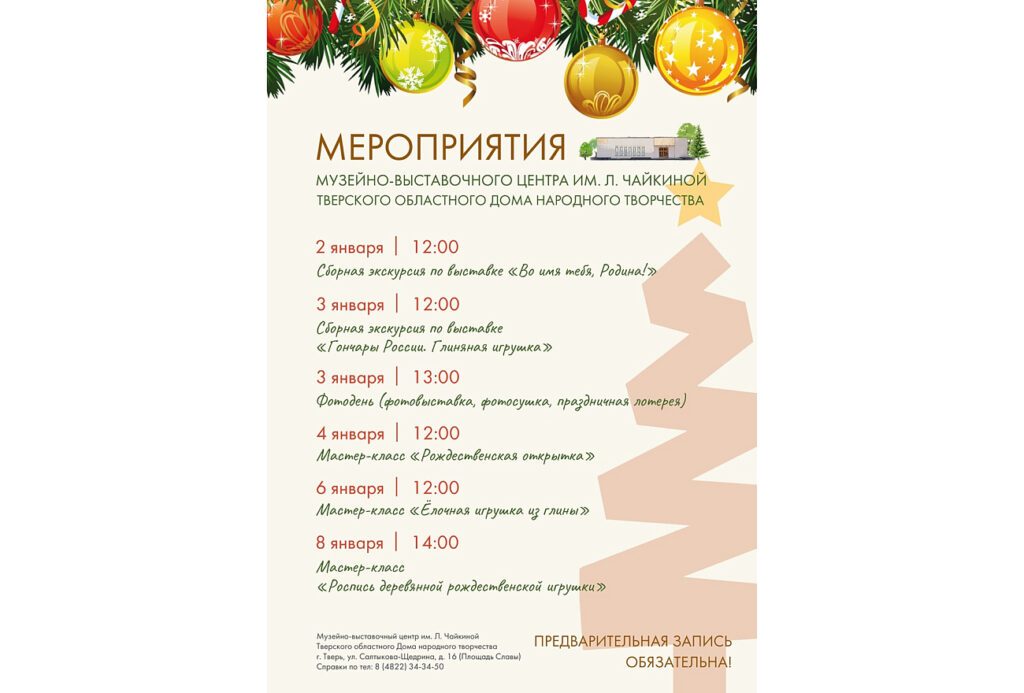Тверской областной Дом народного творчества приглашает жителей и гостей Верхневолжья в новогодние выходные дни посетить разнообразные мероприятия.