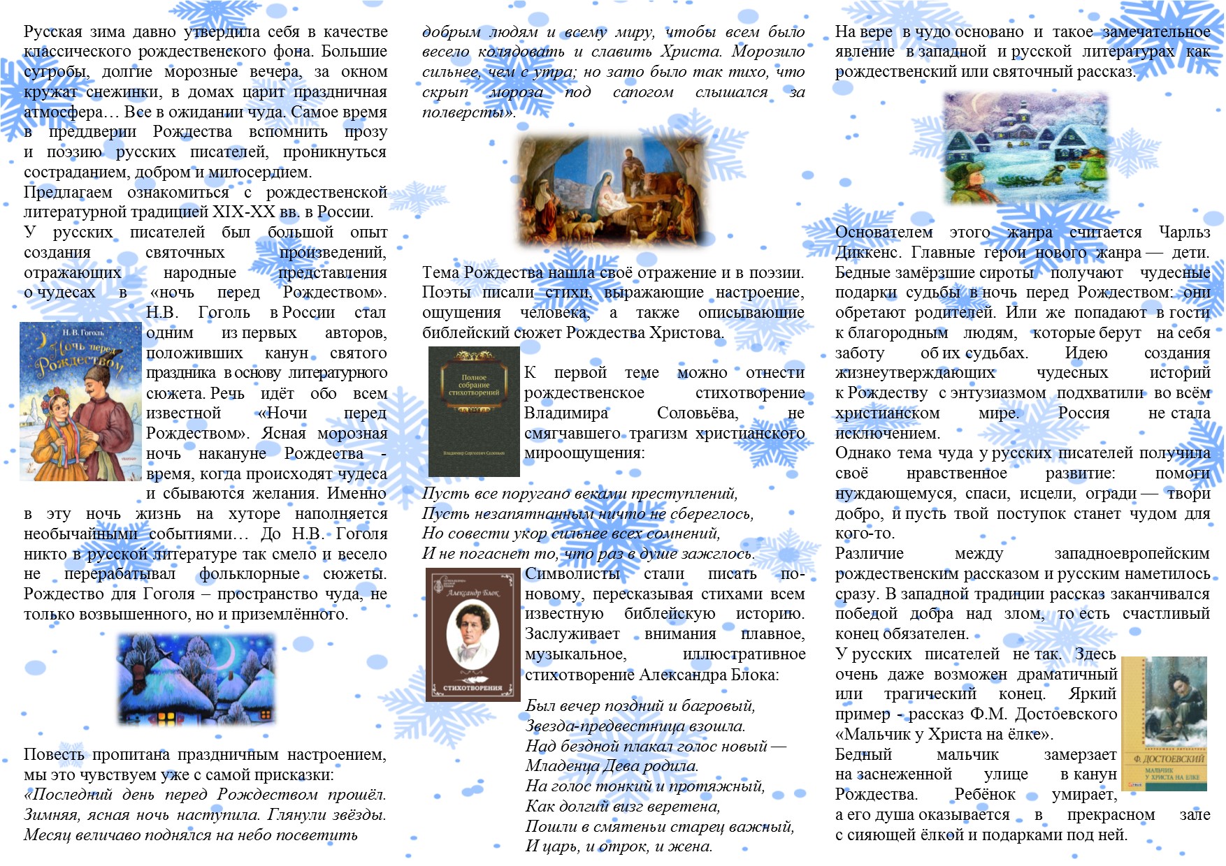 Русская зима давно утвердила себя в качестве классического рождественского фона. Большие сугробы, долгие морозные вечера, за окном кружат снежинки, в домах царит праздничная атмосфера… Все в ожидании чуда. Самое время в преддверии Рождества вспомнить прозу и поэзию русских писателей, проникнуться состраданием, добром и милосердием.