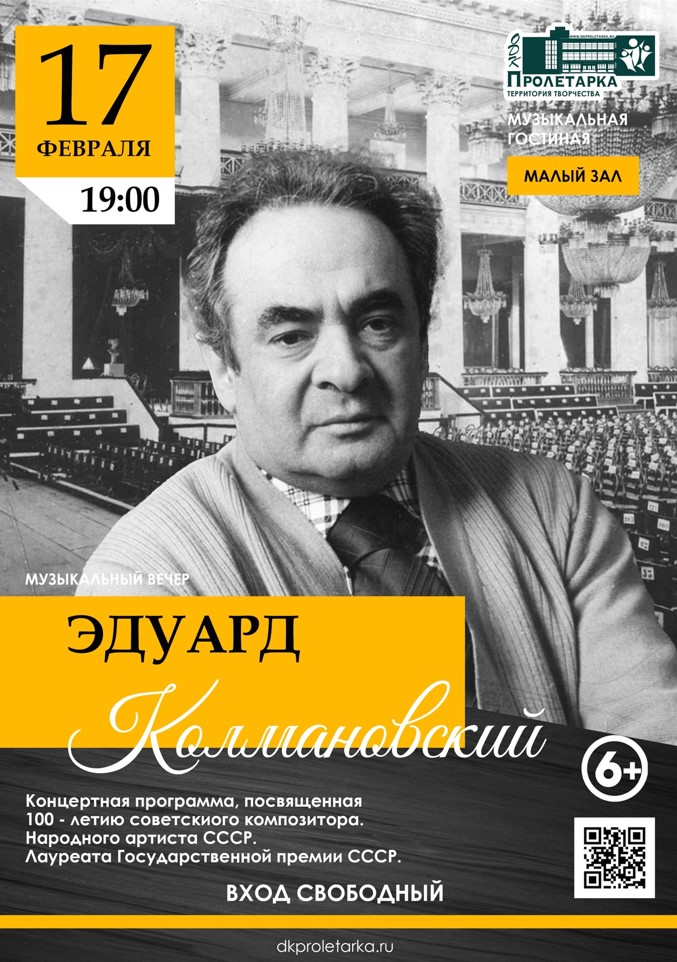 В Твери в ДК «Пролетарка» 17 февраля в 19:00 в малом киноконцертном зале пройдет вечер «Музыкальной гостиной» в честь 100-летия со дня рождения советского композитора Эдуарда Колмановского.