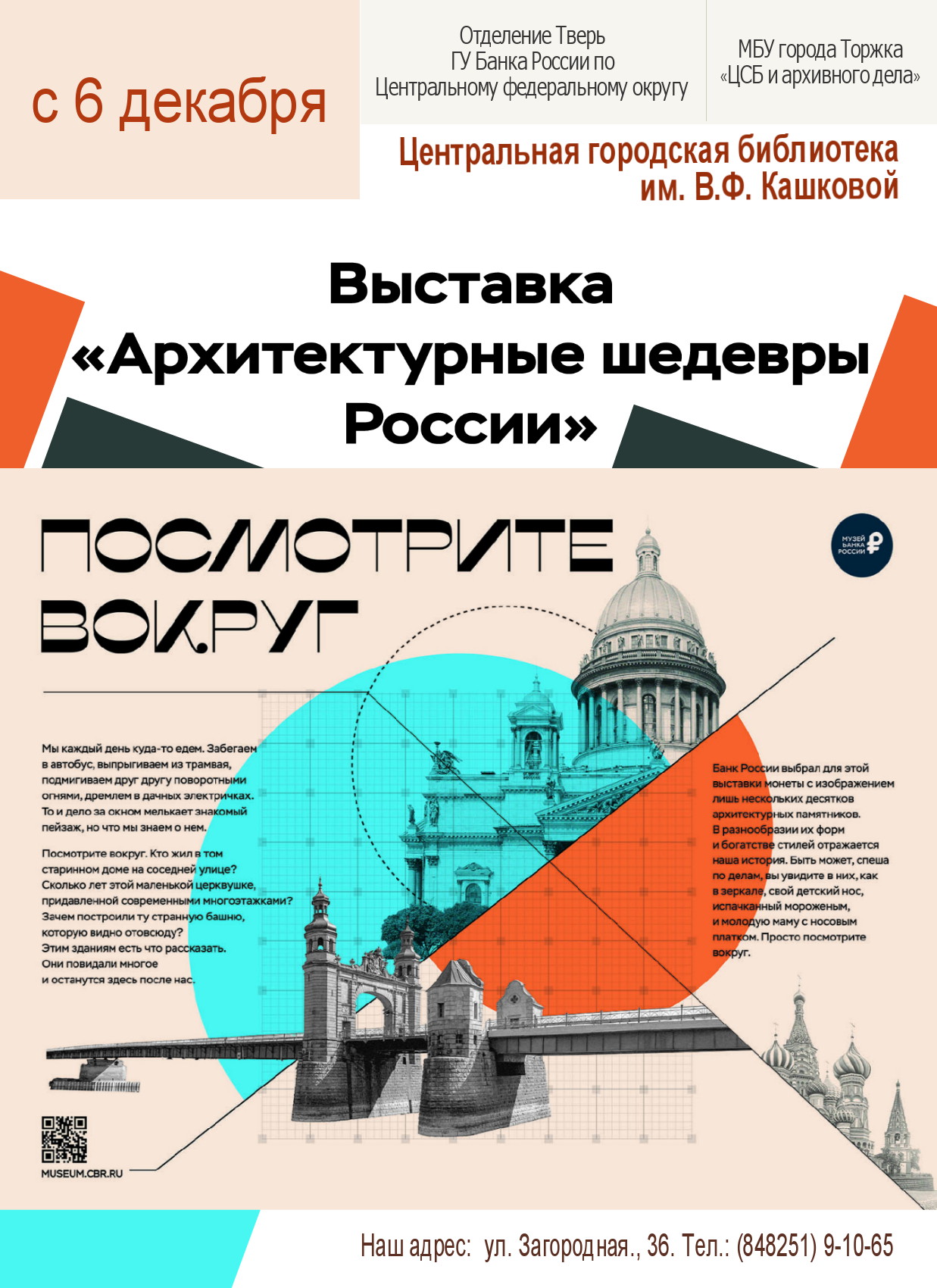 С 6 декабря в Центральной городской библиотеке имени В. Ф. Кашковой работает выставка «Архитектурные шедевры России», организованная Отделением Тверь ГУ Банка России по Центральному федеральному округу.