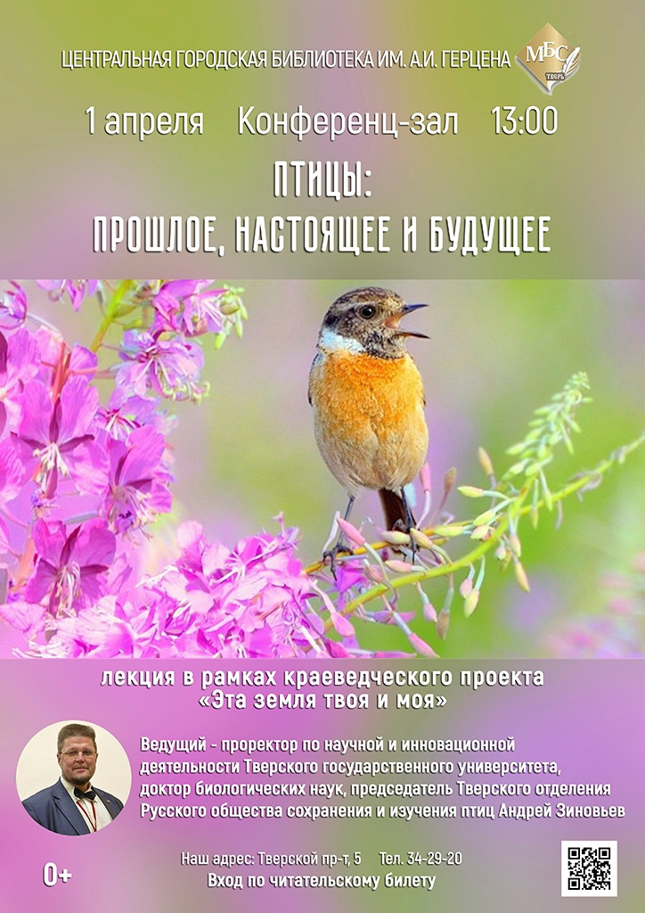 В рамках краеведческого проекта «Эта земля твоя и моя» в конференц-зале библиотеки выступит проректор по научной и инновационной деятельности Тверского государственного университета, доктор биологических наук, председатель Тверского отделения Русского общества сохранения и изучения птиц Андрей Зиновьев. Начало в 13.00, вход свободный.