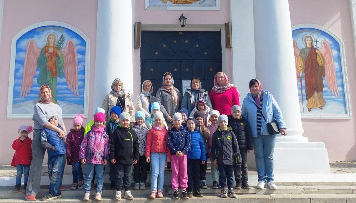 В Светлую среду прошла Божественная литургия, на которой воспитанники дружно пели тропарь Христова Воскресения, а после все прошли крестным ходом вокруг здания садика.
