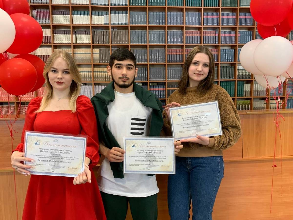 Во время проведения лекции студентам-активистам «Единой России» Веронике Сахаровой , Ибрагиму Иллазову и Виктории Андреевой , которые участвовали в организации «Лыжни России-2023», вручили Благодарность от депутата Законодательного Собрания Тверской области Сергея Аксенова .