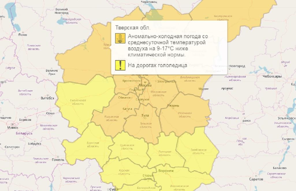 К гололедице, из-за которой с утра в четверг был объявлен «желтый» уровень опасности, прибавились аномально низкие температуры — теперь регион на прогностической карте ЦФО стал «оранжевым».