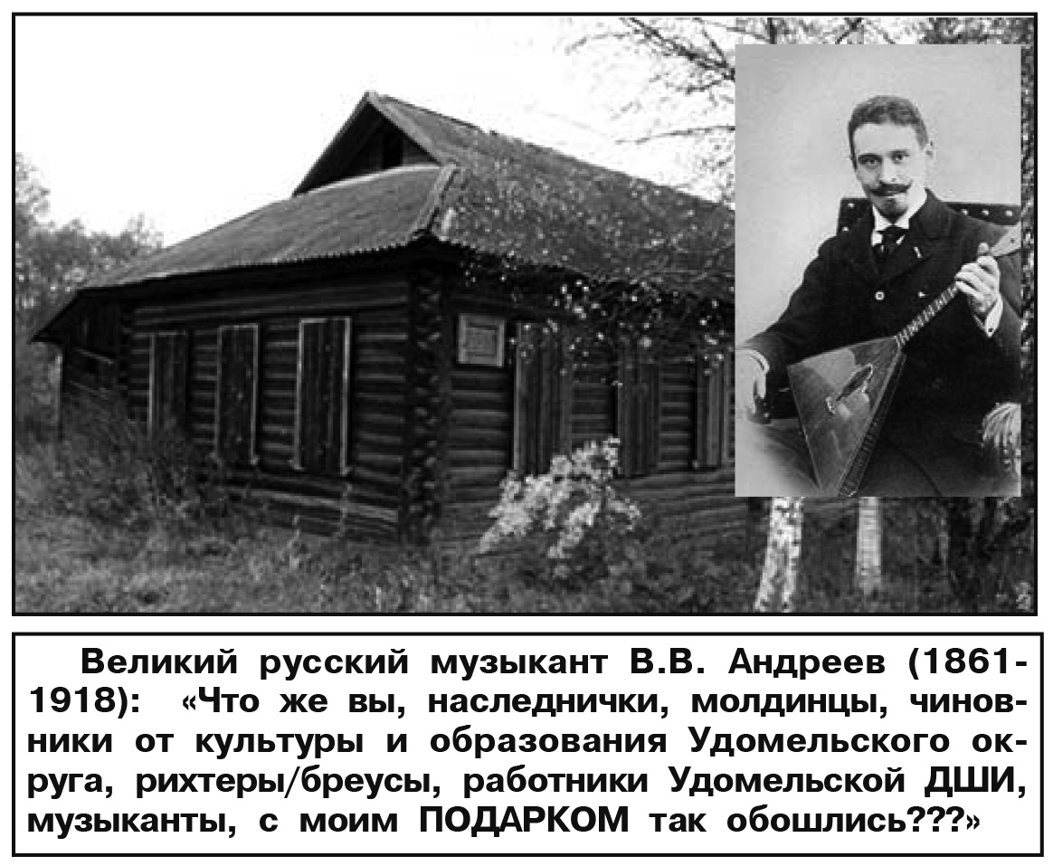 В «Голосе Удомли» я регулярно поднимаю проблему сохранения культурного наследия Удомельского края. В «ГУ» от 25.05.2023 г. я в очередной раз поднял вопрос о сохранении деревянной школы в селе Молдино, которую великий русский музыкант Василий Васильевич Андреев (1861-1918) построил на свои средства в 1908 г. и подарил молдинцам, где в дальнейшем учились многие поколения жителей всей округи. Эта школа — единственный материальный памятник Андрееву на Удомельской земле.