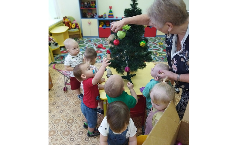 Малыши группы №7 совместно с воспитателями нарядили зеленую красавицу: повесили разноцветные огоньки, шары, гирлянды. Как весело плясали маленькие детки вокруг елки!
