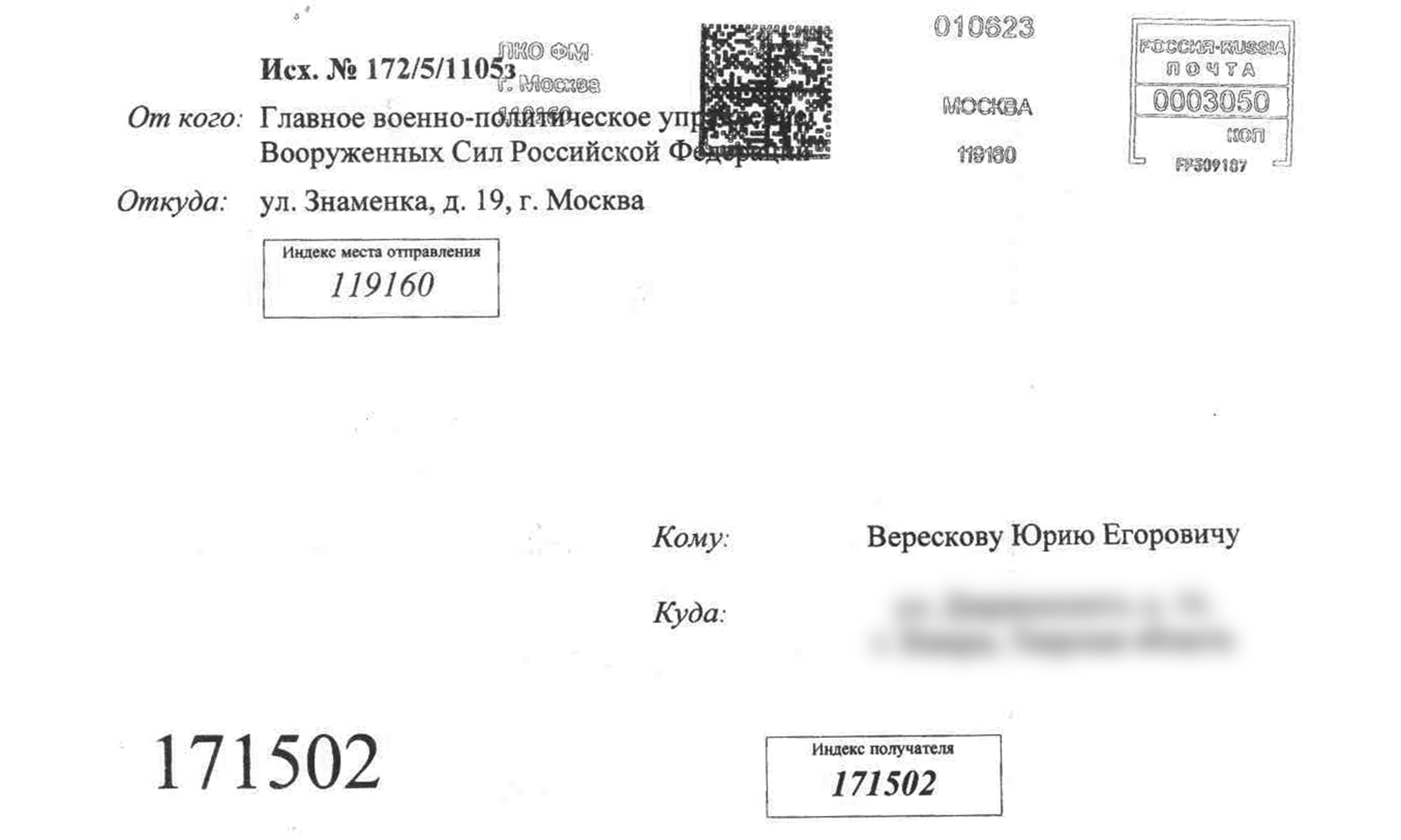 Жителю города Кимры Юрию Егоровичу Верескову предложено принять участие в акции «Письмо солдату» и направить пожелания защитникам Отечества в Центральный дом Российской Армии имени М.В. Фрунзе для последующего отправления российским военнослужащим в районы проведения специальной военной операции.