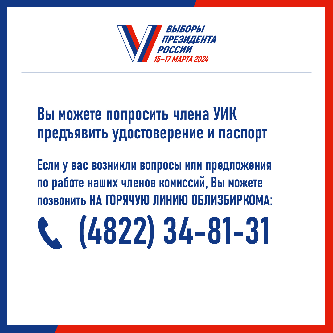 Уважаемые избиратели! С 17 февраля по 7 марта 2024 года на всей территории страны, включая Тверскую область, будет проводиться подомовой (поквартирный) обход избирателей в рамках федерального проекта «ИнформУИК».