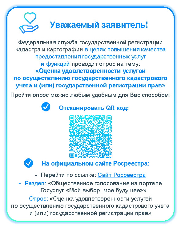 В целях повышения эффективности реализации ключевых мероприятий и задач цифровой трансформации Росреестра, информирую Вас о проведении опроса на тему «Оценка удовлетворённости услугой по осуществлению государственного кадастрового учёта и (или) государственной регистрации прав». Для достижения максимального количества респондентов прошу провести опрос сотрудников, а также разместить информацию об опросе во всех точках взаимодействия с гражданами и юридическими лицами.