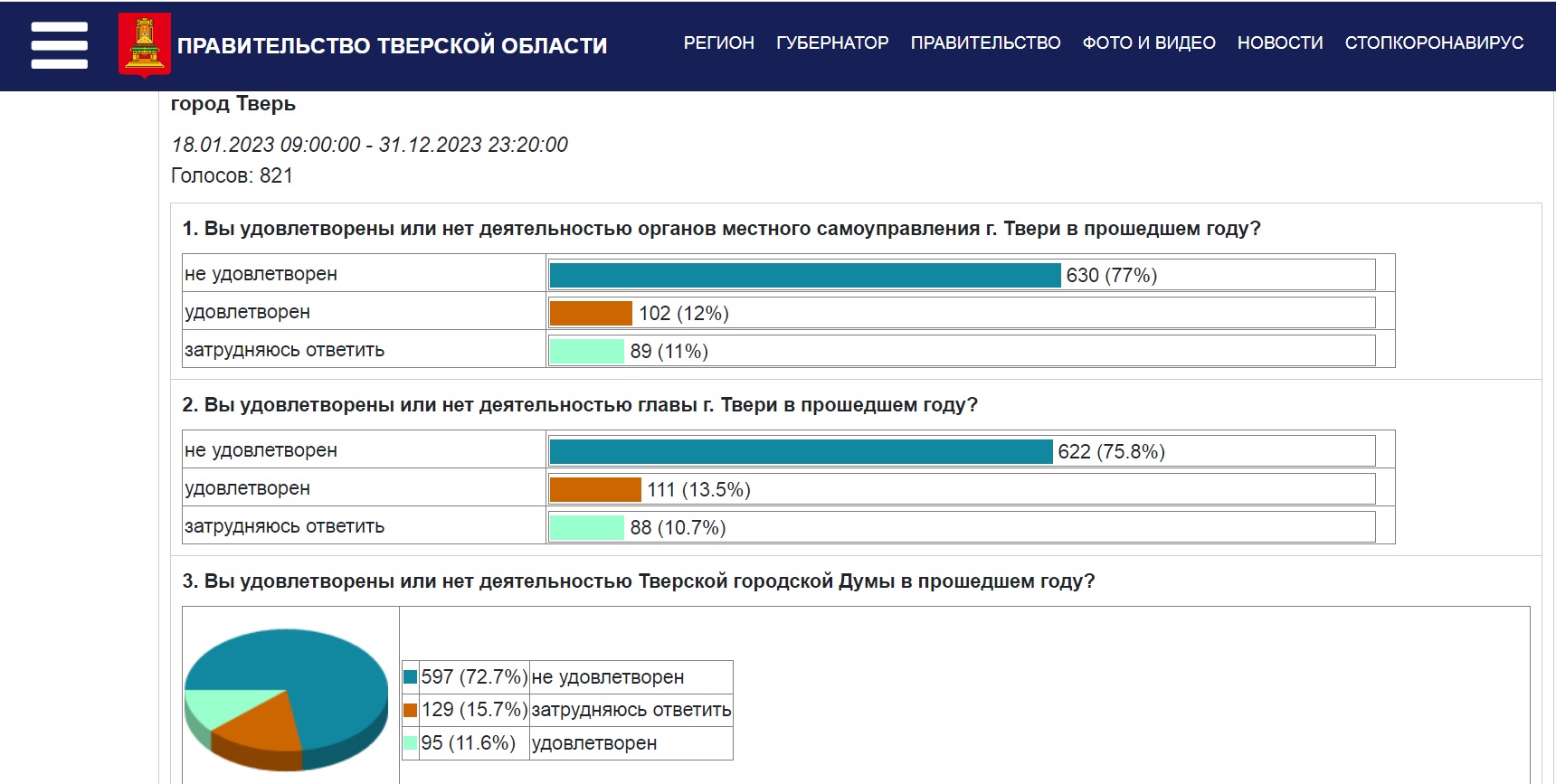 Голосование началось 18 января и будет продолжаться весь год , тем не менее, уже сейчас можно посмотреть первые результаты, к примеру, по областному центру. На момент подготовки этого материала 77% от свыше 800 принявших участие в опросе жителей Твери не удовлетворены деятельностью органов местного самоуправления, 75% недовольны работой главы города, 72% «не оценили» работу городской Думы.