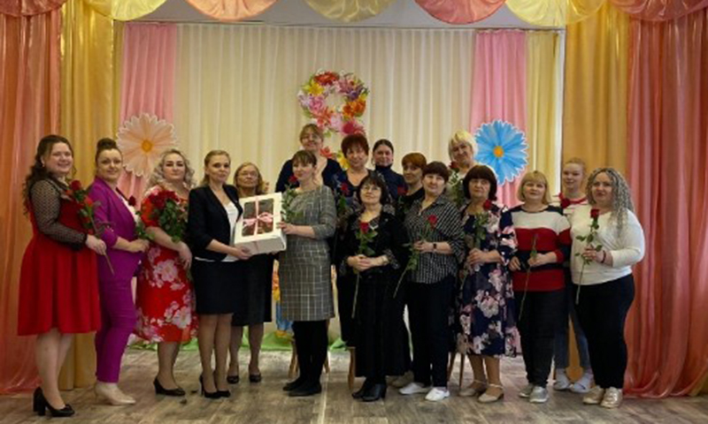 Придя с утра на работу, воспитатели с удивлением обнаружили в актовом зале плакат с поздравлением, а также приглашение на встречу. На встрече присутствовали все женщины из коллектива детского сада. Представители родительских комитетов групп преподнесли всем сотрудникам МДОУ розы, а также большой, красивый и очень вкусный торт!