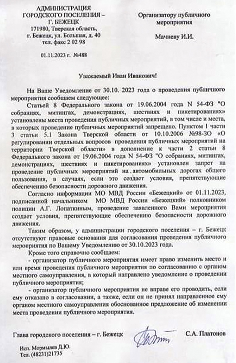 «Полковник бежецкой полиции Лопаткин А.Г. подписал бумагу, что колонна автомобилей на дороге «небезопасна», а это отлично подходит под расплывчатый российский закон, позволяющий властям отменить любой неугодный митинг. Таким образом, подсудимый (всё ещё) глава (до сих пор) городского поселения г.Бежецк Платонов С.А., суд над которым откладывается уже полтора года, апеллирует к непреложному закону и не может согласовать мероприятие» , — сообщают организаторы протестного мероприятия.