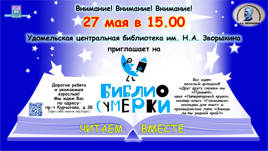 Удомельская центральная библиотека им. Н.А. Зворыкина присоединяется к Всероссийской акции «Библиосумерки», которая в 2023 году проходит под девизом «Читаем вместе»