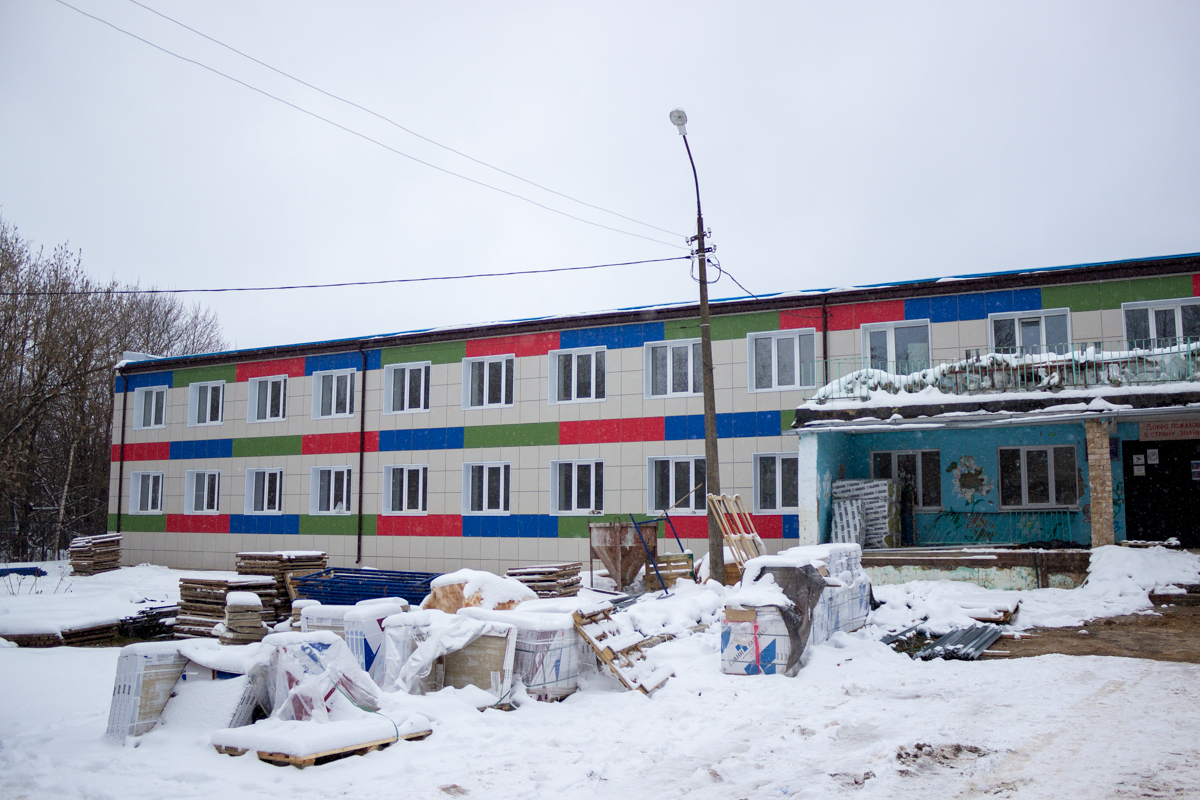 В здании начальной школы ведутся работы по устройству фасадной плитки, оштукатуриванию стен, разводке инженерных коммуникаций. Работы по кровле завершены.