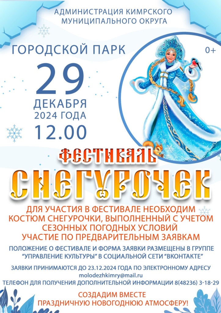 Для участия в Фестивале необходим костюм Снегурочки, выполненный с учетом сезонных погодных условий. Участие по предварительным заявкам !