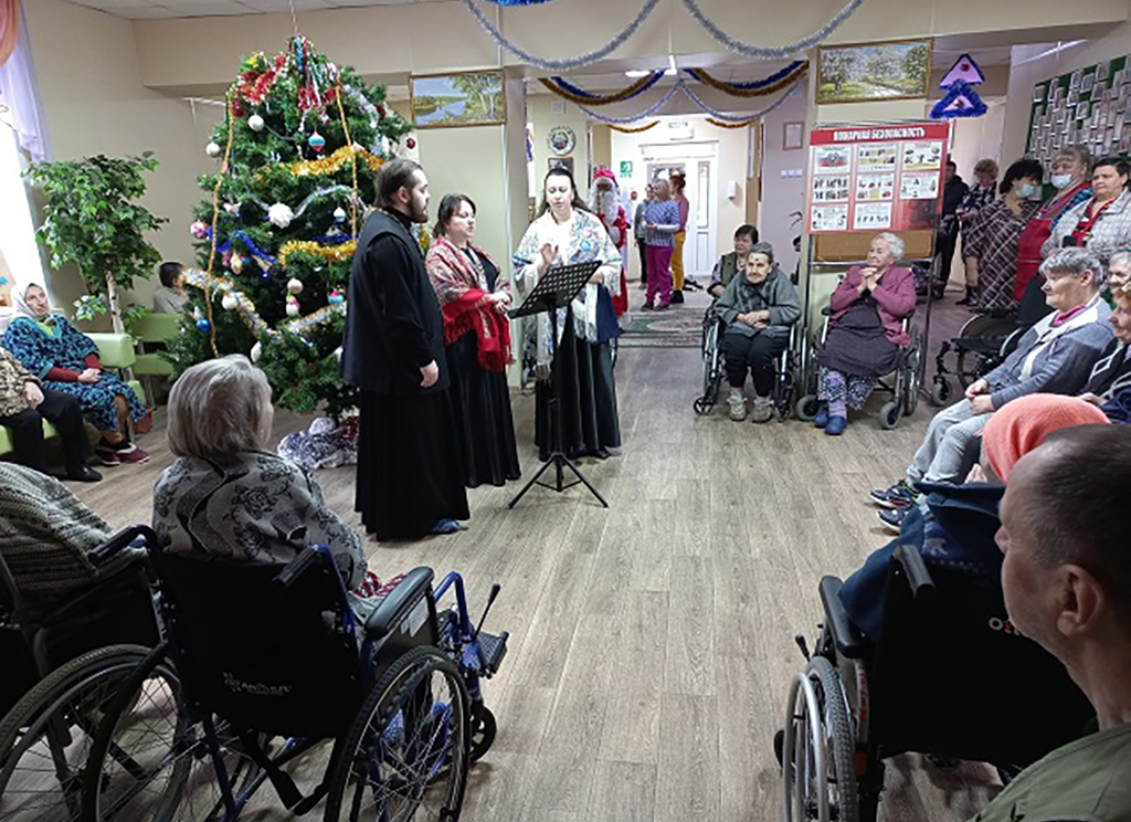 Все желающие собрались у новогодней ёлки. Клирик храма в честь иконы Божией Матери «Неупиваемая Чаша» священник Сергий Губский-Борисов поздравил бабушек и дедушек с Рождеством Христовым и вместе с певчими клиросного хора «Лик» исполнил рождественские песнопения и колядки. Всем вручили сладкие подарки.