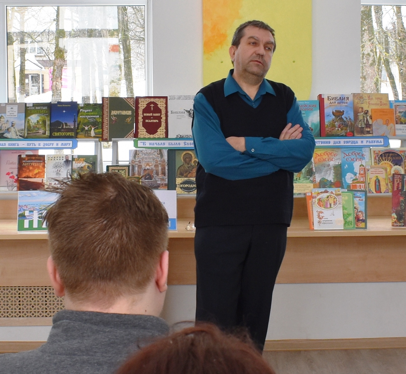 Ведущий мероприятия Валерий Викторович Линкевич , рассказал ребятам о возникновении этого праздника, поведал, что же такое Библия, Евангелие и подчеркнул, что чтение правильных книг - это основа всего, что это самые мудрые учителя жизни. Он познакомил студентов с книжной выставкой «Живое слово мудрости духовной» , более подробно остановившись на книгах Н.А. Павловой «Красная Пасха» - о трех Оптинских новомучениках, убиенных на Пасху 1993 года и на духовно – просветительном издании Протоиерея Андрея Ткачева «Наше время». Ребята проявили интерес к рассказу, задавали много интересующих их вопросов.