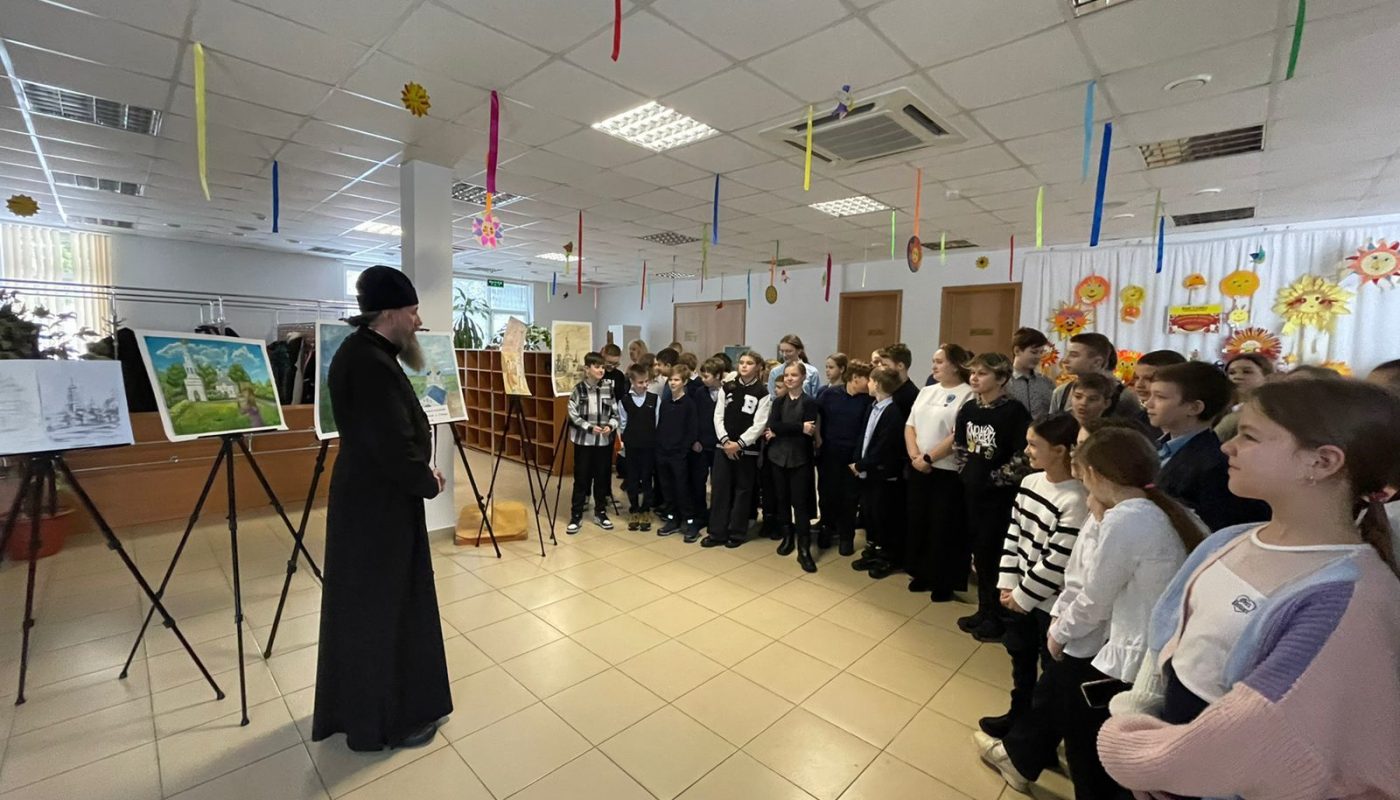 Вместе с директором досугового центра Татьяной Вересовой священник познакомил детей и педагогов с передвижной выставкой детских работ художественной школы имени Серова города Твери, приуроченной к юбилеям Храмового комплекса села Завидово.
