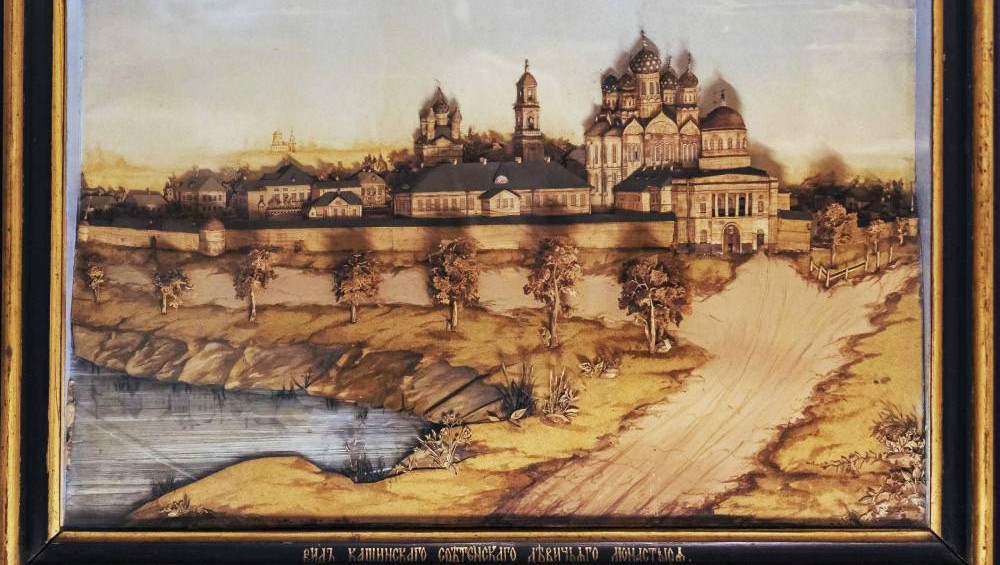 В праздник Сретения Господня в Кашинском музее представили уникальную резную картину из пробки "Вид Кашинского Сретенского монастыря".