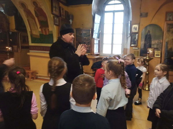 Кто- то из ребят уже бывал в храме с мамой или бабушкой, а для некоторых поход в храм состоялся впервые. Детей встретил настоятель Свято-Троицкого храма протоиерей Сергий Желябовский. Отец Сергий показал детям, как нужно правильно креститься, когда входишь в храм. Рассказал, что в храме есть много старинных икон. Икона – это священное изображение Бога, Божией Матери, святых угодников Божиих и событий Священной истории. Батюшка объяснил, что когда хотят помолиться, ставят свечу перед иконой и обращаются со словами молитвы к тому, кто изображён на иконе. Школьники смогли задать свои вопросы. В основном вопросы были о Боге: «Почему распяли Иисуса Христа?», «Для чего нужно носить крестик?», «Почему на стенах храма изображены люди, и кто они?». Дети получили массу впечатлений от посещения церкви и узнали много интересного. Уходя, они чётко понимали, что храм – это дом Божий, это место священное. Очень приятно видеть, как чистые души детей имеют неподдельный, живой интерес к духовным знаниям, а мы взрослые можем им немножко помочь, открыть, показать дорогу к ним. И, безусловно, такие понятия необходимо закладывать ребёнку с самого раннего возраста. Экскурсия была очень насыщенная информацией и эмоциями. Детям так понравилось в храме, что они захотели прийти сюда ещё.