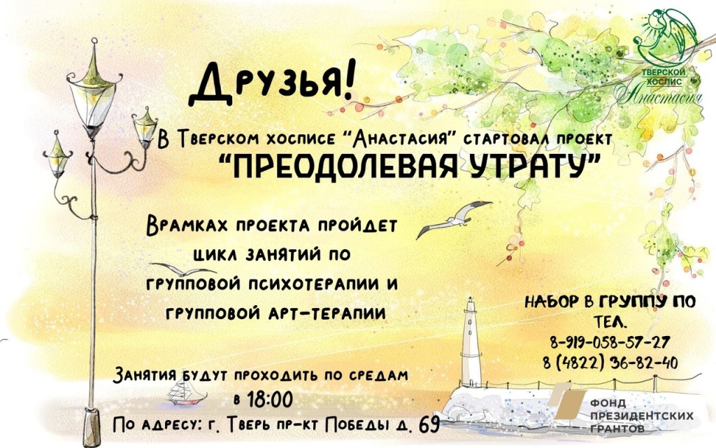 Проект «Преодолевая утрату» поддержан фондом Президентских грантов. В феврале была проведена подготовительная работа. С 6 марта на базе хосписа «Анастасия» начнут работать открытые групповые программы: групповая психотерапия, групповая арт-терапия, индивидуальные встречи с психологом и «встречи без куратора».