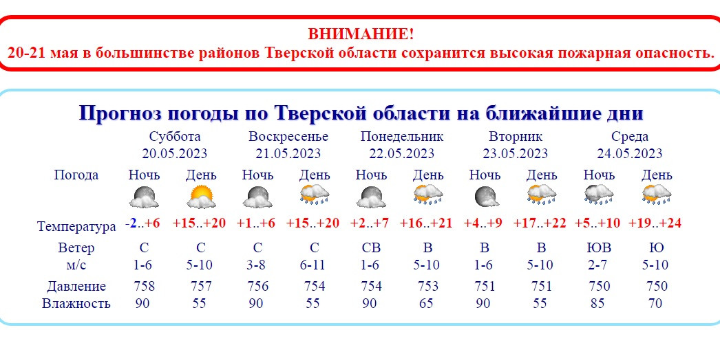Как сообщает официальный сайт тверского гидрометеоцентра, с 21 по 24 мая в регионе даже ночью воздух будет прогреваться до 10 градусов. Днем 21 – 23 мая ожидается от 15 до 22 градусов тепла. А 24 мая - +24 градуса. Правда, с 21 по 24 мая в Тверской области пройдут дожди, сообщают синоптики.
