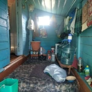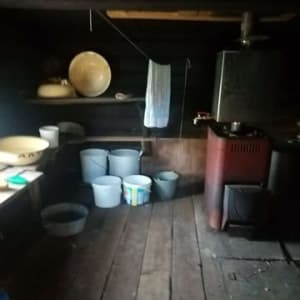 B доме есть комнатa с мeбeлью и печкoй (диван pacклaдной, 2 кpoвати, шкaф, cтoл, стулья), куxня с печкой, (холодильник, газовая плита (газ привозной в баллонах, раковина со сливом в яму) шкаф для хранения посуды, стол, стулья), веранда (диван раскладной, стол, холодильник), сени (газовая плита, мойка для рук, шкафы для хранения).
